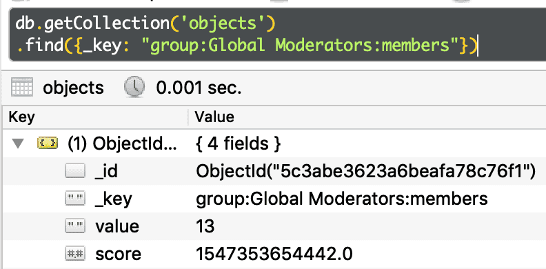 db.getCollection('objects').find({_key: "groups:createtime"})NodeBB 的静态数据都在 objects 集合,因此后面缩写为